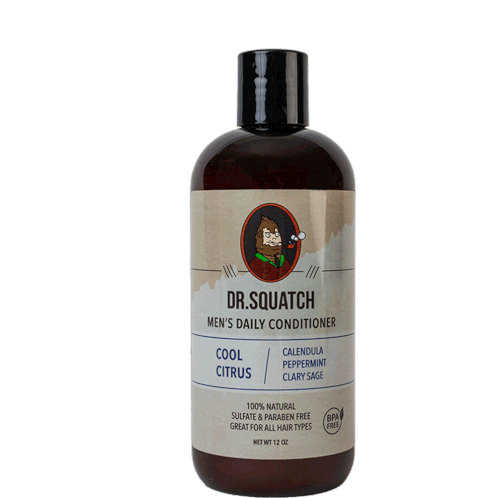 A bottle of Dr. Squatch Men's Daily Conditioner in Cool Citrus scent, featuring natural ingredients like calendula and peppermint.