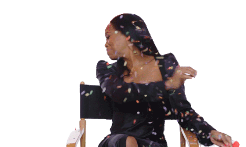 a woman in a black dress is sitting in a director 's chair with confetti falling on her
