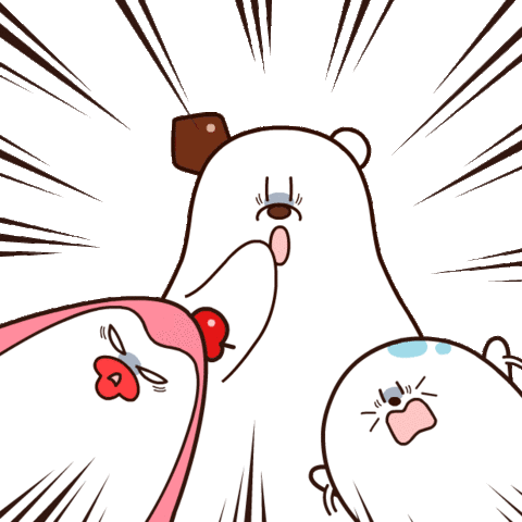 Three adorable cartoon characters react with extreme shock and surprise, featuring radiating lines and wide-eyed expressions.