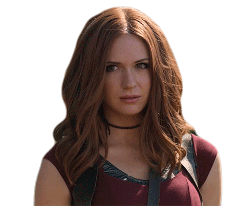 Karen Gillan as Ruby Roundhouse from Jumanji, showing a confused and concerned expression with a slight eye widen.
