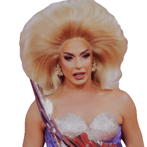 Alyssa Edwards, a drag queen, shows a confused or speechless expression with her iconic large blonde wig and sparkly outfit.