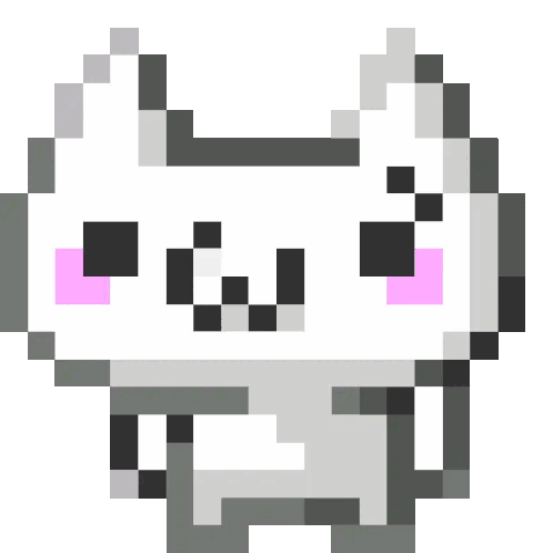 A cute pixel art Toro Inoue cat looks confused, with pink cheeks and nose, and a gently wagging tail.