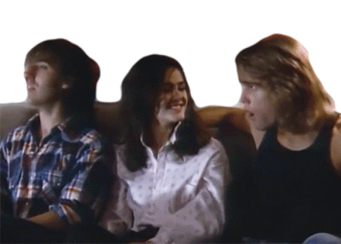 An enthusiastic hug between three people on a couch, celebrating a 'Congratulations' moment, linked to Aerosmith's 'Let The Music Do The Talking Song'.