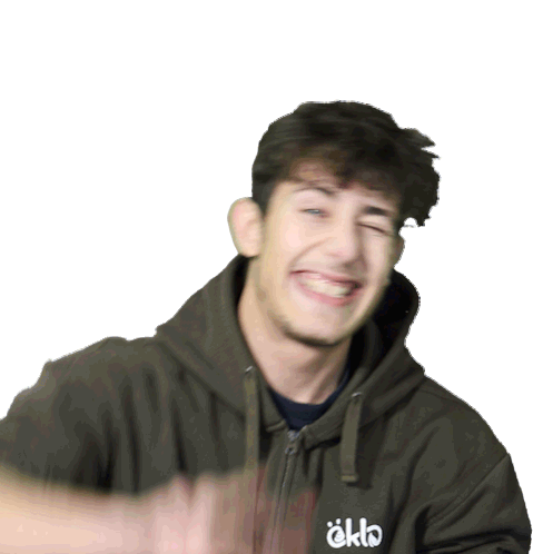 Connor winks and smiles, making a peace sign with his hand while wearing an 'öklo' hoodie.