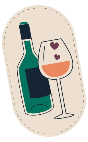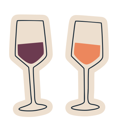 Two stylized wine glasses, one with red wine and one with orange wine, clinking together in a celebratory toast.