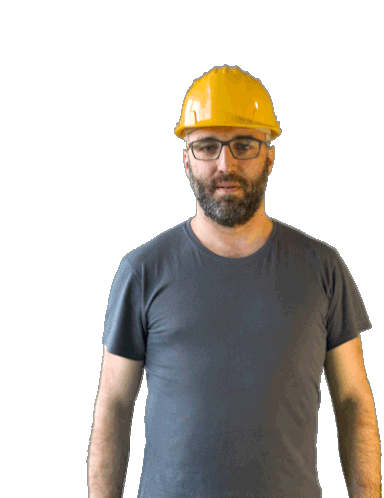 A construction worker in a yellow hard hat and glasses makes a "little bit" gesture with his fingers.