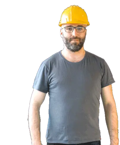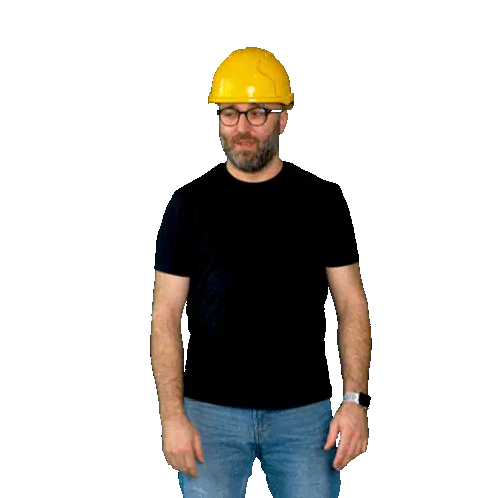 A construction worker, possibly Josef or Benes, holds a Hilti nail gun, ready for work on a project.