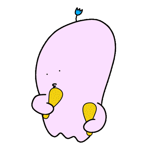 A cute, light purple cartoon character with a blue flower on its head happily eats two golden fried chicken drumsticks.
