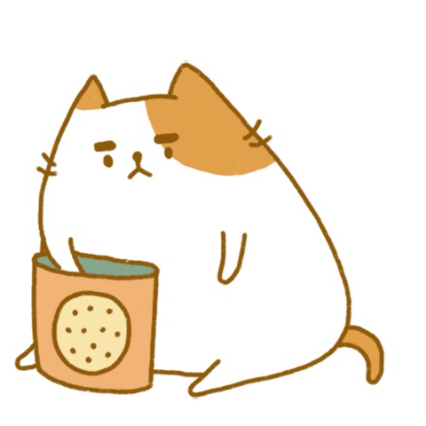 A cute, chubby white cat with orange patches sits contentedly next to a container of cookies, looking pleased.