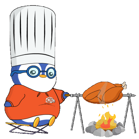A cute Pudgy Penguin chef happily roasts a whole chicken over an open fire, preparing a delicious meal.