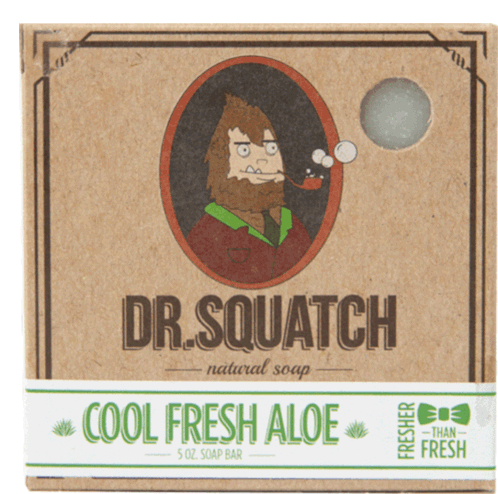 A Dr. Squatch natural soap box featuring the 'Cool Fresh Aloe' scent, with a cartoon Bigfoot character and product details.