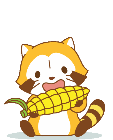 A cute cartoon raccoon happily eats an ear of corn, then gives a satisfied 'Like' with a big smile.