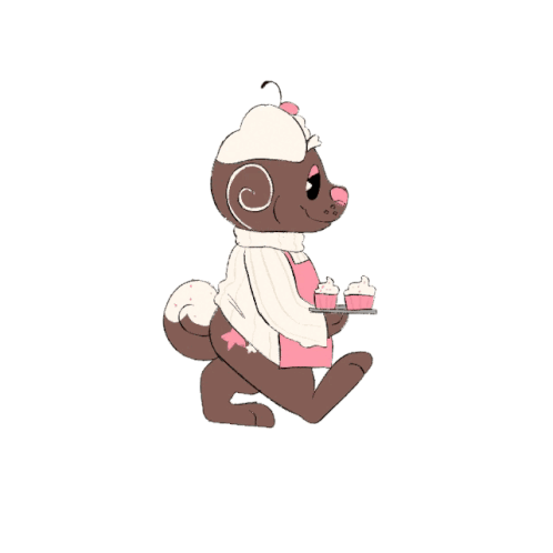 a cartoon of a dog wearing a sweater and scarf holding a tray of cupcakes