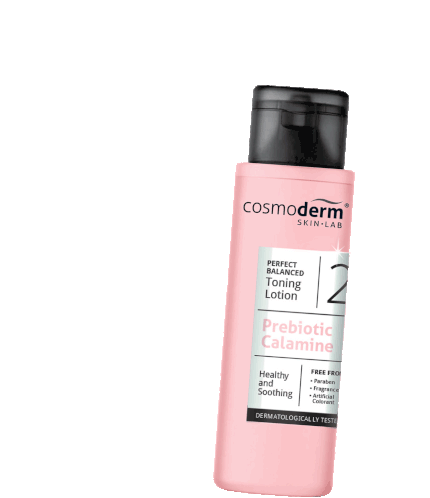 Animated sticker of a pink Cosmoderm Prebiotic Calamine Toning Lotion bottle, highlighting its healthy and soothing properties.