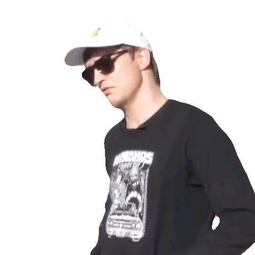 Danny Mullen, wearing a hat and sunglasses, coughs and gags, covering his mouth with his hand in a repetitive motion.