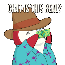 A pudgy penguin in a hat checks a "fish dollar" bill, asking "Chat, is this real?".
