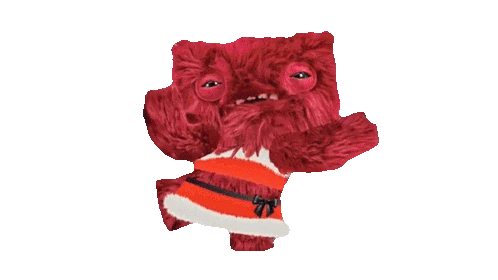 A red Fuggler monster, dressed in a festive Christmas outfit, covers its wide eyes in a scared or surprised peek.