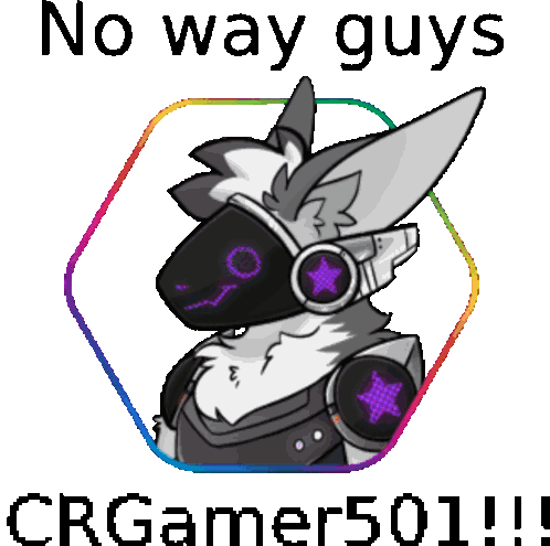 A protogen character, CRGamer501, is featured with the text 'No way guys' and 'CRGamer501!!!' in a colorful hexagon.