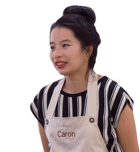 Caron from Great Canadian Baking Show reacts with a cringed expression, wearing her apron.