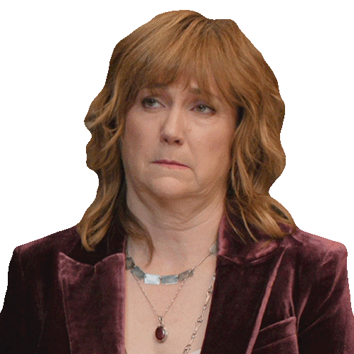 Julie, played by Jennifer Whalen, cringes and winces with an embarrassed expression, wearing a velvet jacket and necklace.