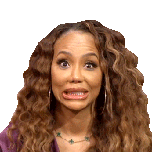 Tamar Braxton makes an exaggerated cringing, disgusted, or shocked "yikes" face with wide eyes and a scrunched mouth.