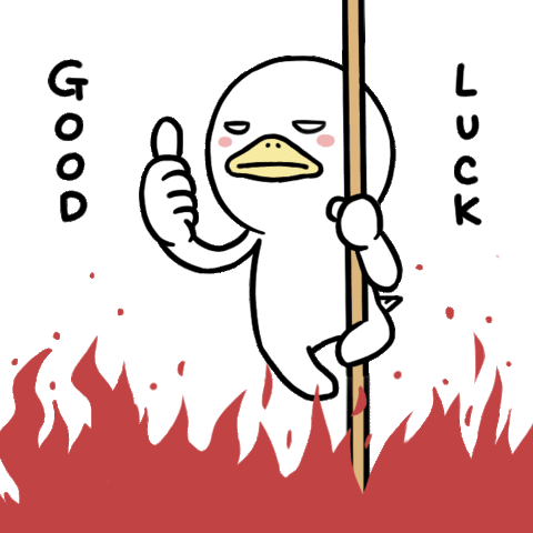 A wooden pole stands amidst rising red flames, suggesting a challenging situation or a fiery trial, perhaps with a hidden wish for good luck.