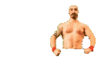 A pixel art crossfit athlete, shirtless and with a mustache, flexes his biceps, showcasing strength and a retro aesthetic.