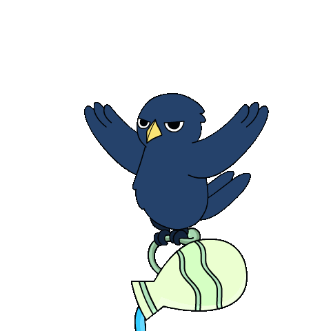 A grumpy cartoon crow with dark blue feathers and a yellow beak sits on a light green Aquarius pitcher, pouring liquid.