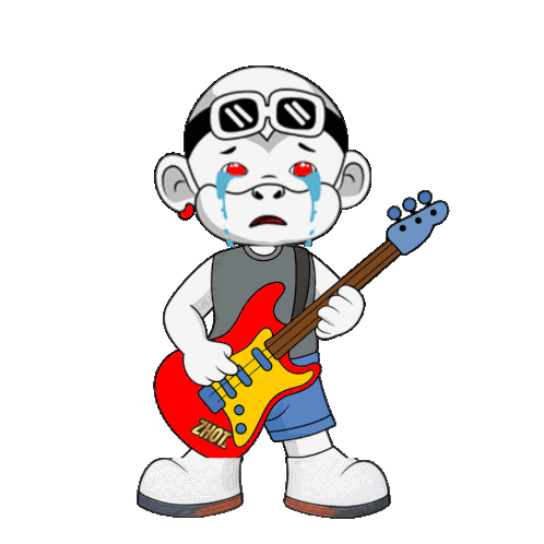 a cartoon character is crying while holding a red guitar that says zhot on it