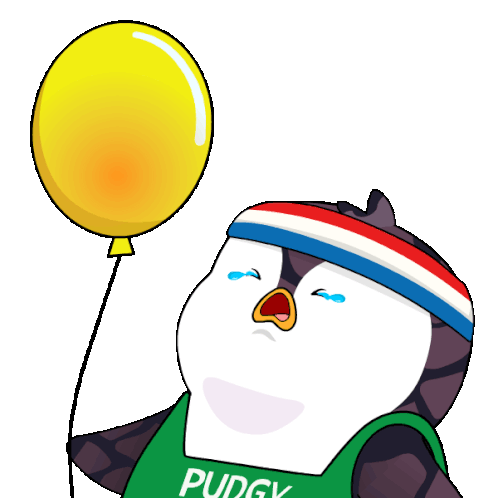 A distressed Pudgy Penguin cries with tears streaming, wearing a green "PUDGY" shirt and a red, white, and blue headband, holding a yellow balloon.
