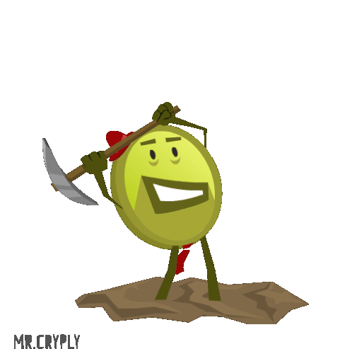 An animated Cryply character, a green bean-like figure, enthusiastically mines for Bitcoin with a pickaxe.