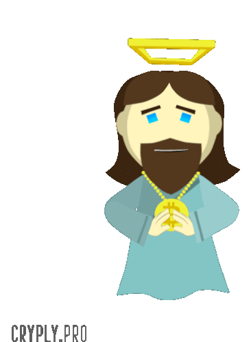 Cryply Cryptojesus, a cartoon Jesus with a Bitcoin necklace, gives a cheerful thumbs up, celebrating crypto success.