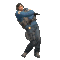 a man in a blue jacket and jeans is dancing in a pixel art style .