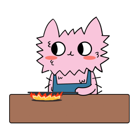 A delightful cartoon animal chef, adorned in a chef's hat and pink apron, joyfully prepares food in a sizzling frying pan.