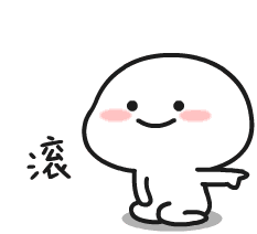 A cute, blob-like cartoon character with pink cheeks smiles and points left, accompanied by the Chinese character '滚'.