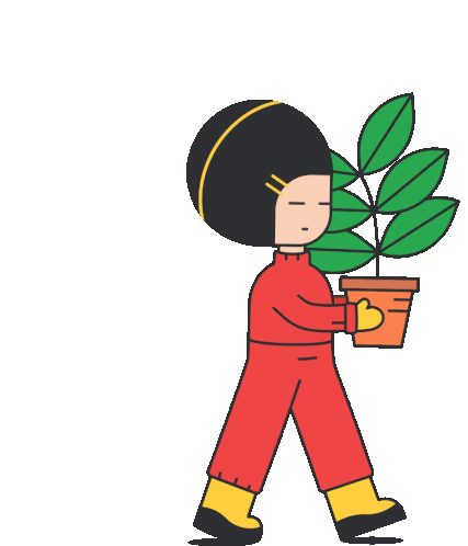 A cute animated girl in a red jumpsuit and yellow boots walks while holding a potted green plant.