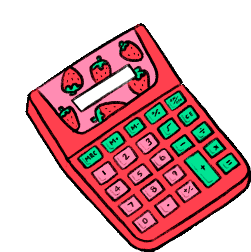 A cute red calculator with strawberry decorations and a screen displaying 'CUTE !'. Perfect for adding a touch of kawaii to messages.