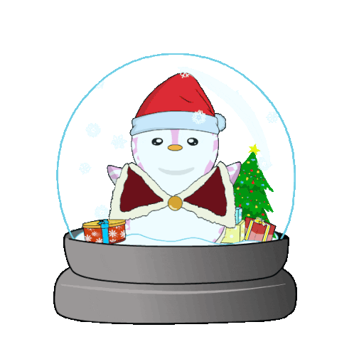 A charming animated sticker featuring a cute penguin-like character in a festive snowglobe, surrounded by Christmas gifts and a tree.