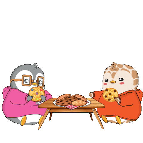 Two adorable cartoon penguins in hoodies happily munch on delicious cookies, sharing a sweet moment at a tiny picnic table.