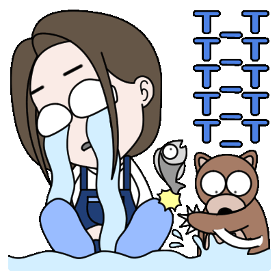 A cute and funny sticker of a girl with bobbed hair crying profusely, with a surprised bear splashing in her tears.