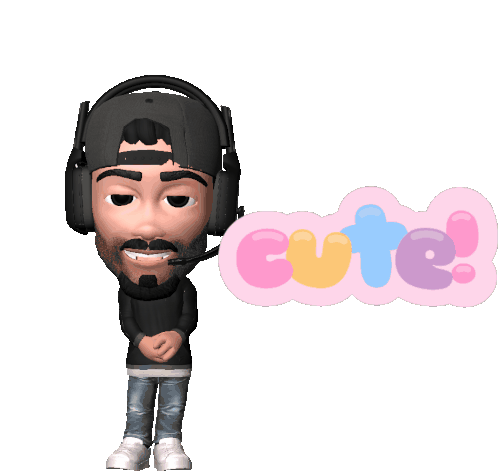 A cute 3D animated character with headphones and a beard, saying "Cute!" in a pink speech bubble.