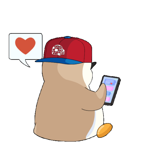 A cute Pudgy Penguin wearing a red cap is engrossed in texting on a smartphone, surrounded by floating hearts.