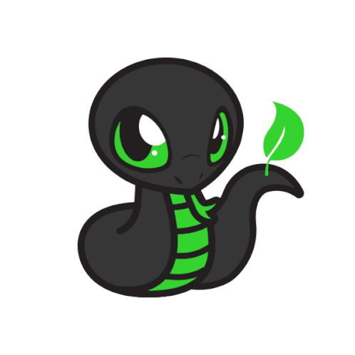 A cute black and green cartoon snake, Sneki, with the word 'sustainable' and a leaf, promoting eco-friendliness.