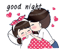 A cute cartoon couple, with the man gently kissing the woman's cheek as she rests, wishing her a good night.