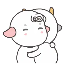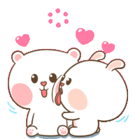 Adorable animated sticker of a white bear and a white rabbit sharing a sweet kiss, surrounded by floating pink hearts.