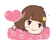 A cute cartoon girl with brown hair holds a pink heart lollipop, smiling while lying on a bunny-patterned pillow.