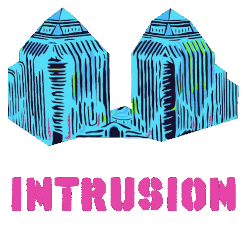 Mule Yong's glitch art sticker featuring abstract pink structures and the word 'INTRUSION' in a cyber-themed animation.