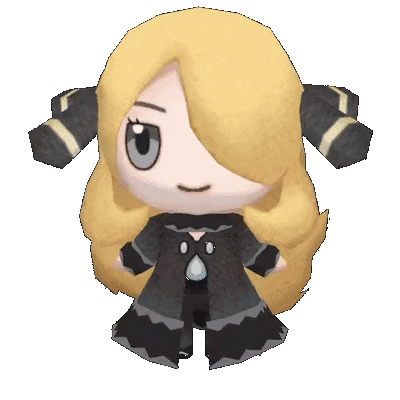 Animated 3D plushie sticker of Cynthia from Pokémon Masters EX, showcasing her adorable chibi design in a smooth rotation.