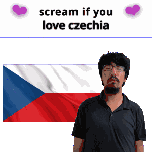 a man with glasses stands in front of a czech flag with the words scream if you love czechia