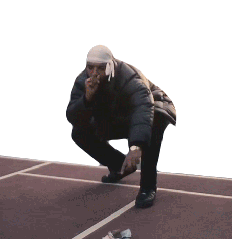 Aissa squats on a track, looking at dice on the ground, then makes a gesture. Ready for a game.